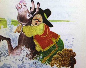 الاغی که بار نمک داشت زیر سنگینی آن عرق می ریخت و رفیقش که بار سبک اسفنج را حمل می کرد در دلش به او می خندید. بهر حال از تپه ای بالا رفتند و از سمت دیگرش پایین آمدند و سرانجام به یک نهر آب رسیدند.